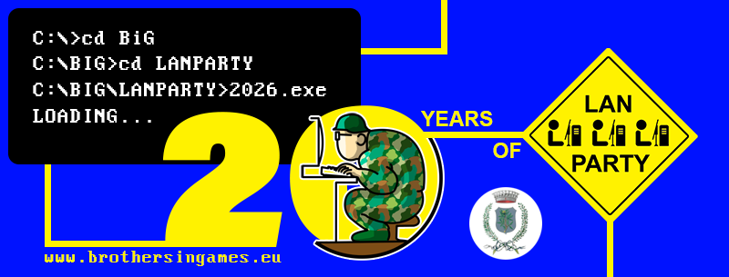 Tutti i dettagli e il modulo di iscrizione sono disponibili qui: https://www.brothersingames.eu/big-lan-party-2026-20-years-edition/